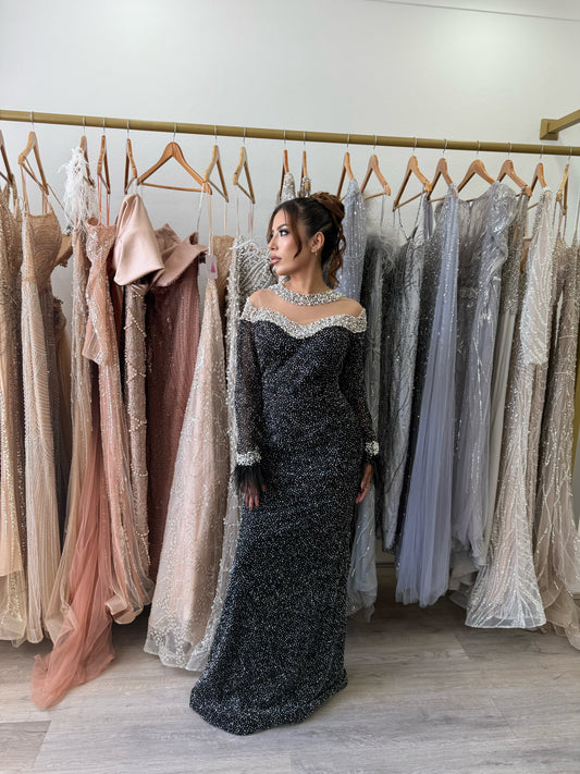 black fully beaded formal dress